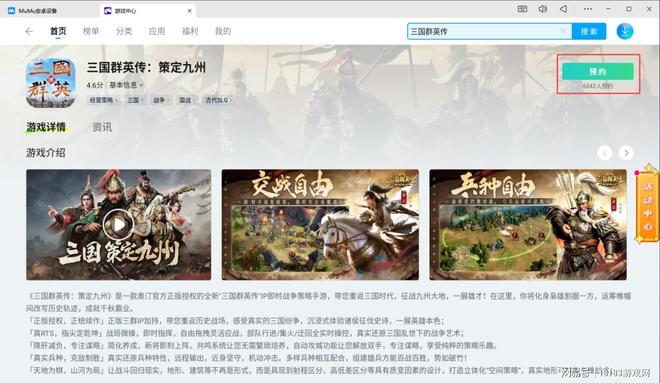 方法一:启动模拟器,进入游戏中心搜索“三国群英传:策定九州”,点击预约,待游戏公测开启即可畅玩;