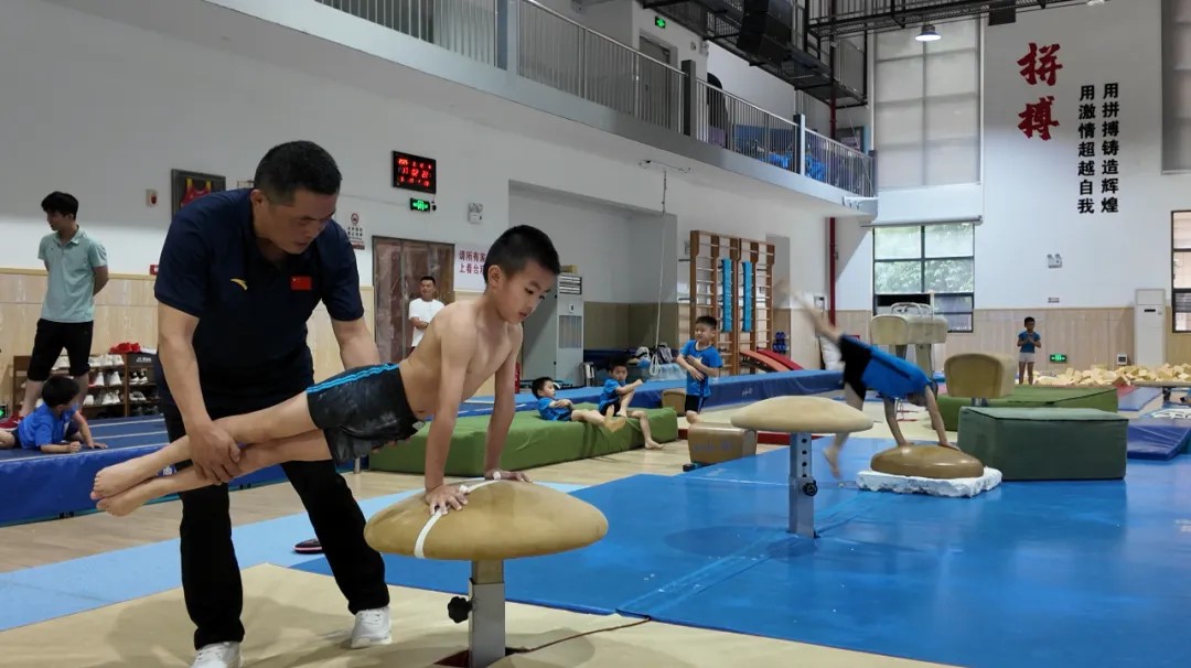 长沙市体操学校训练馆内,一群幼小的身影在训练器械上翻腾飞跃。邱琦站在场边,眼神紧跟着这些小运动员。