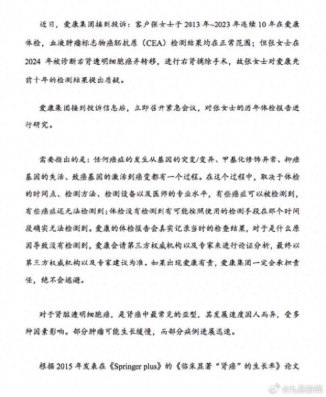 近日,爱康集团接到投诉:客户张女士于2013 年~2023年连续10年在爱康体检,血液肿瘤标志物癌胚抗原(CEA)检测结果均在正常范围;但张女士在2024年被诊断右肾透明细胞癌并转移,进行右肾摘除手术,故张女士对爱康先前十年的检测结果提出质疑。