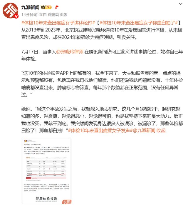 从2013年到2023年,北京执业律师张晓玲连续10年在爱康国宾进行体检,从未检查出患癌风险,却在2024年被确诊为癌症晚期,引发关注。
