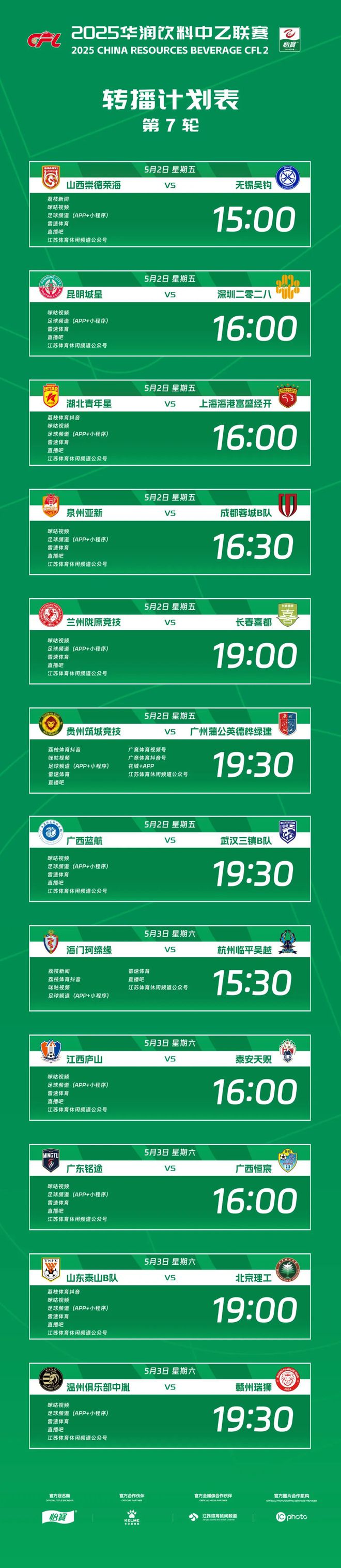5月2日-3日,2025华润饮料中乙联赛将展开第7轮的较量,届时,多家平台将对比赛进行转播。敬请关注!