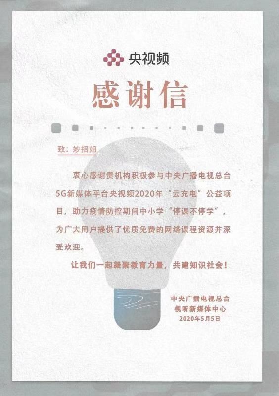 5月5日,“妙招姐”团队还收到了央视频的感谢信:感谢妙招姐助力疫情防控期间中小学“停课不停学”,提供优质免费有创意的网络课程资源。