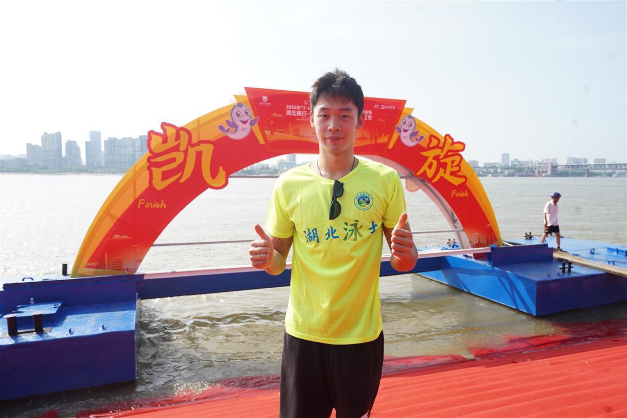 在横渡方队起水点,一名年轻的小朋友引起了记者的关注。他叫殷西武,来自青春渡方队。年仅14岁的他今年读初三,是青春渡方队中年龄最小的队员。据悉,2019年创立的青春渡方队,是渡江节首支年轻化群众方阵,今年的队员年龄在14岁至35岁,平均年龄为26岁。殷西武告诉记者:“这是我第一次参加渡江节,激动的同时也有点小紧张,能顺利完赛感觉很棒。明年我还想参加渡江节,继续逐浪长江!”