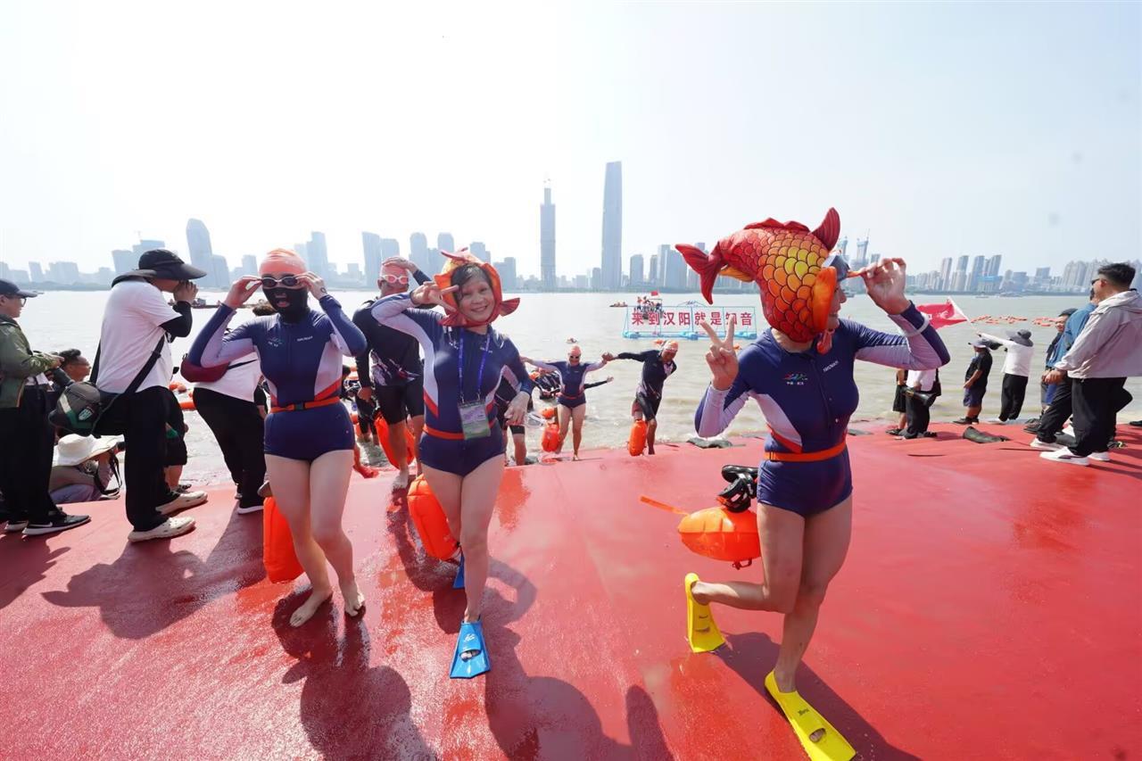 个人抢渡长江挑战赛结束后,群众方队横渡长江活动紧随其后。这些来自武汉本地以及广东、山西、新乡、盐城、孝感等地的横渡队员们,共计2058名“泳”者组成了27支方队。8点35分,万里长江横渡方队喊出嘹亮的口号率先下水,朝终点游去。首支方队“万里长江横渡方队”是本届渡江节的先锋,他们来自海军工程大学,大家身着特色泳装、高擎红旗,在长江中展现军人本色,既象征勇气与责任,又映照着武汉城市精神。