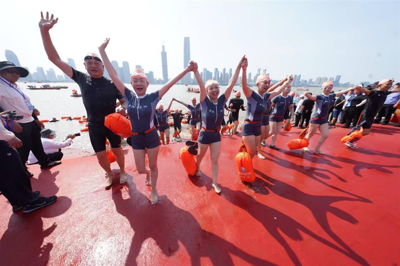 千里长江涌起滔滔波浪,救援船与医疗船于江中环绕,守护着每一位游泳者的安全。千人竞渡、百舸争流的壮阔场面,展现了武汉江城的澎湃活力。在两岸的呐喊助威中,27支方队的所有队员都成功抵岸。队员们神采奕奕,脸上洋溢着自豪的笑容,共同携手从江面走来,横渡长江的豪情点燃全场。