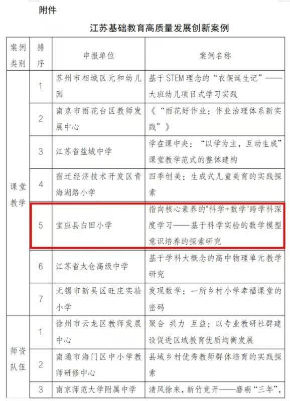 近日,江苏省教育科学研究院正式发布《关于公布江苏基础教育高质量发展创新案例的通知》(苏教科院〔2025〕17号)。宝应县白田小学申报的课堂教学改革案例成功入选全省66个高质量发展创新案例,并成为扬州市唯一入选“课堂教学”类别的案例。这份省级荣誉,标志着该校作为全国义务教育教学改革实验校(“去讲台:一所乡村学校的教学变革”项目)的创新探索获得高度认可。