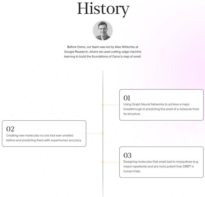 Osmo的CEO及联合创始人是威尔奇(Alex Wiltschko),他在谷歌任职期间发起了一个研究项目,最初聚焦于将气味数字化,并最终实现气味生成的技术探索。2023年,他得到Lux Capital和谷歌投资的6000万美元,将Osmo作为一家独立的初创公司推出。