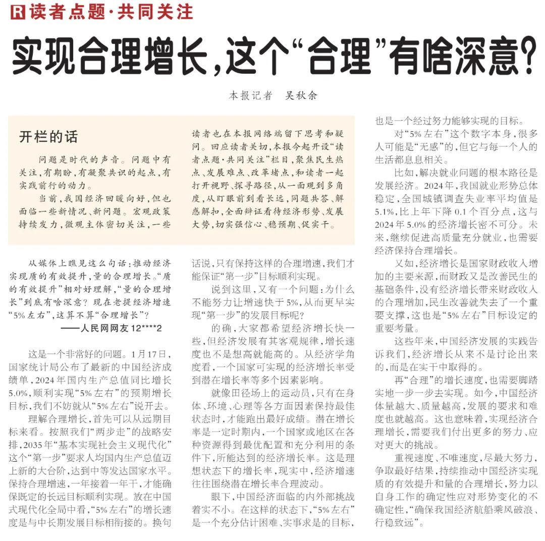 2025年2月5日, “读者点题·共同关注”栏目在人民日报头版开栏,刊发报道《实现合理增长,这个“合理”有啥深意?》。