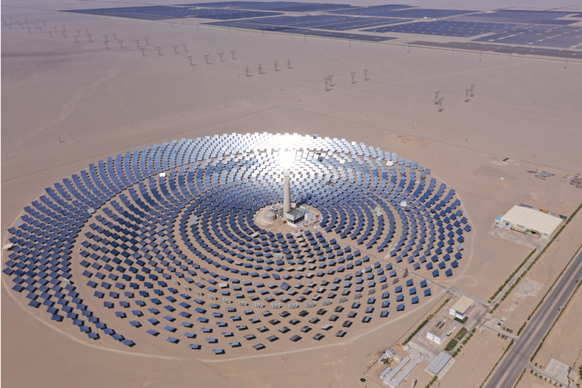 敦煌沙漠的烈日下是一万面镜子组成的发电站,这座国内目前建成规模最大、吸热塔最高、可24小时连续发电的100兆瓦级熔盐塔式光热电站,全年发电量相当于11.7万吨煤(按一吨煤发电3000多度计算),每年可减排二氧化碳35万吨,相当于植树造林1万亩。
