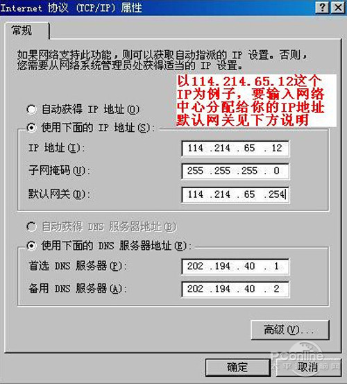 在“常规”选项卡中,中间的“此连接使且下列组件”列表框,选中“Internet协议(TCP/IP)”单击“属性”按钮在出现的“Internet协议(TCP/IP)属性”对话框中选择“常规”选项卡“常规”选项卡中的“使用下列IP地址”单选按钮,然后就可以在下面的文本框中填写需要的IP地址,子网埯码及默认网关了。