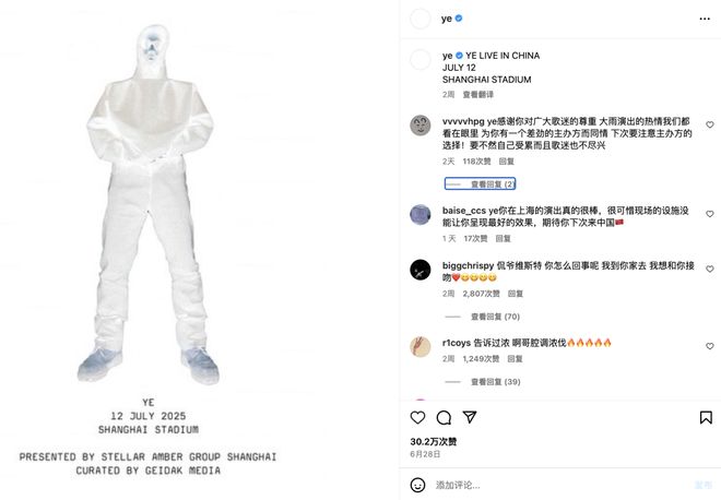 “为你有一个差劲的主办方而同情”、“下次来中国演出之前先看看主办方是什么人”......目前,侃爷的INS和小红书评论区已被大量中国乐迷的留言刷屏;而另一边,上海星珀文化的账号下则充斥着愤怒的声讨,“赔钱!退票!你承诺的亿元舞台在哪里?”、“避雷这个主办方所有演出”。