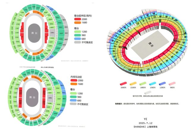 从票价来看更是扎心。去年海口站票价区间为680~2000元,还设有内场互动区;而本次上海站直接飙升至980~2680元,没有内场互动区,但是门票依然大幅上涨,可以看到980元也是犄角旮旯的位置,1280元的则是外圈贴了一层薄边,实际座位数量并不多。