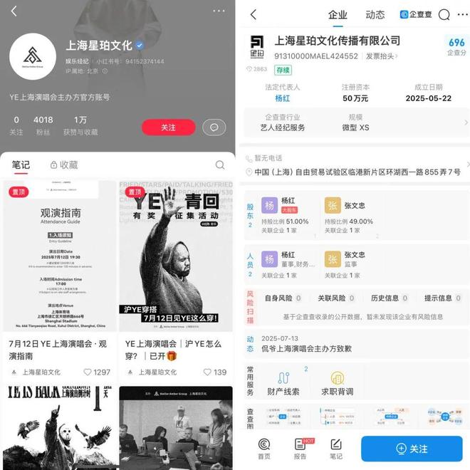 本次侃爷的演唱会是由上海星珀文化主办,根据“企查查”的搜索结果显示,这家公司注册成立于2025年5月22日,而侃爷的演唱会批文是6月12日许可,随后演出开票、演唱会落地......这意味着从公司注册到操办这场数万人的大型演出,前后仅用了不到两个月时间。公司的小红书账号简介直白地写着“YE上海演唱会主办方官方账号”,无论是公司本身还是社交媒体账号,都像是专为这场演唱会临时注册的公司。