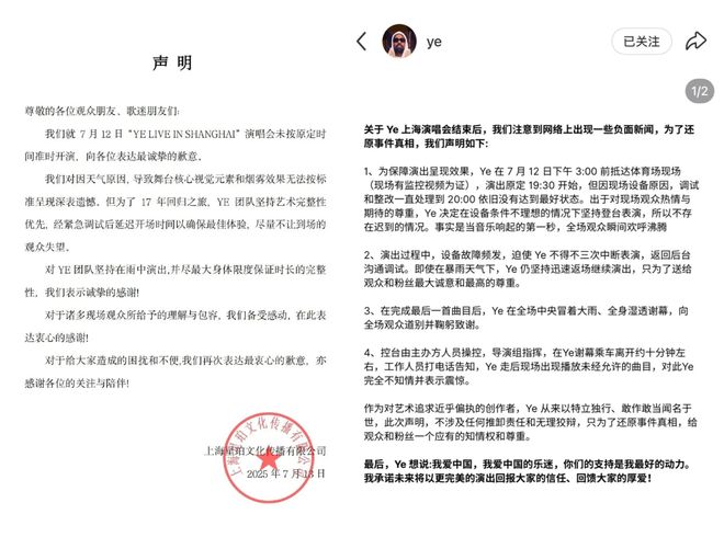 另一方面,7月13日上海星珀文化的道歉声明更是犯了众怒,一堆不痛不痒的言辞将观众情绪推到了更高峰,看似道歉却觉得被冒犯了。一句“YE团队坚持艺术完整性优先”也疑似甩锅,针对观众的体验损失亦没有提到补偿,一时间针对主办方和艺人的负面评价铺天盖地。