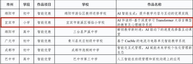 南溪区福临小学校的案例《AI伴读郎——基于深度学习Transformer大语言模型的教育及心理辅导系统》脱颖而出,这是对学校在人工智能教育探索实践的高度肯定!