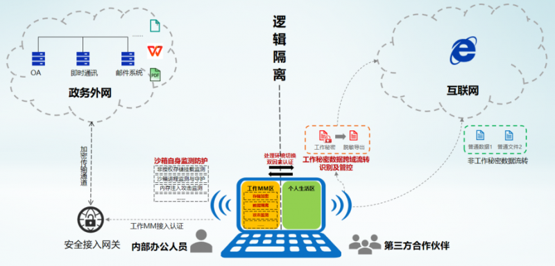 通过建设安全沙箱对终端办公环境实现隔离,既落实《政务外网终端一机两用安全管控技术指南》要求,又满足《工作秘密信息防护指南(试行)》的终端信息防护的运行环境隔离要求,使用网络隔离、应用隔离、存储隔离等多种隔离技术,从运行环境、桌面会话、数据存储、网络传输、外设使用等方面构建安全计算环境,保障工作秘密信息在终端上的存储、处理、传输安全,形成全面的终端数据隔离防护能力。