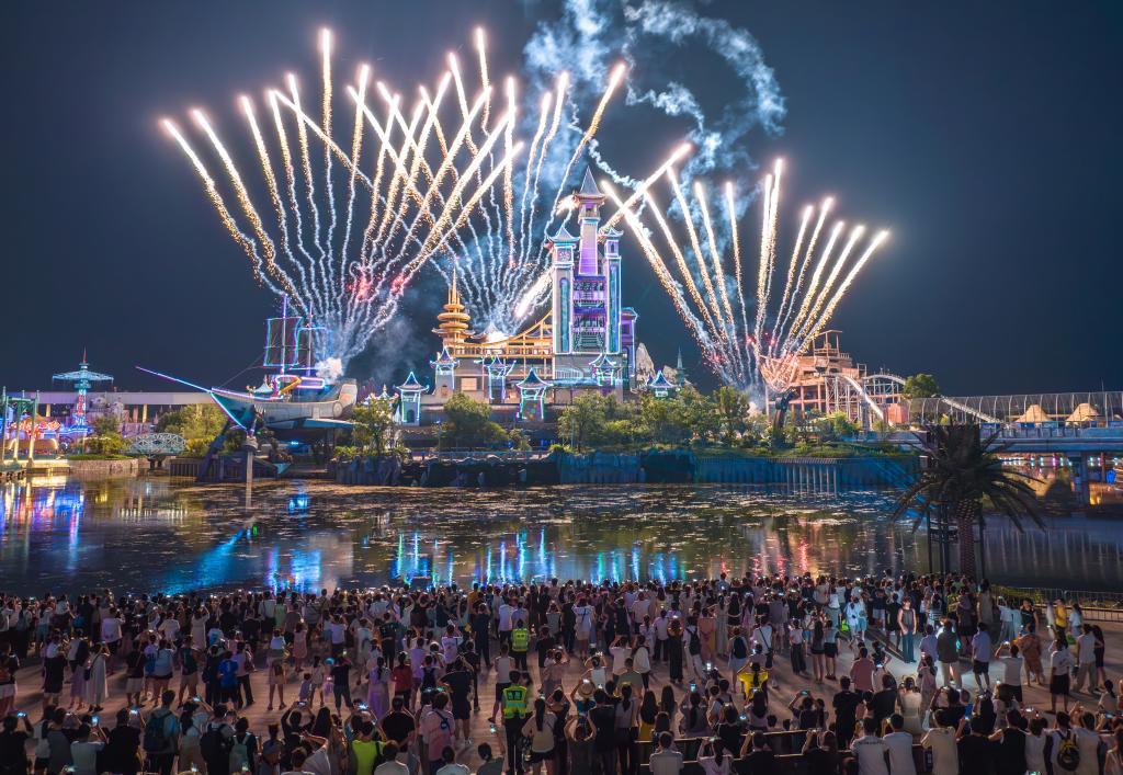 7月19日,在湖北省襄阳市华侨城奇幻谷,游客观看大型夜间演艺秀《奇幻城堡光影秀》(无人机照片)。 新华社发(杨东 摄)