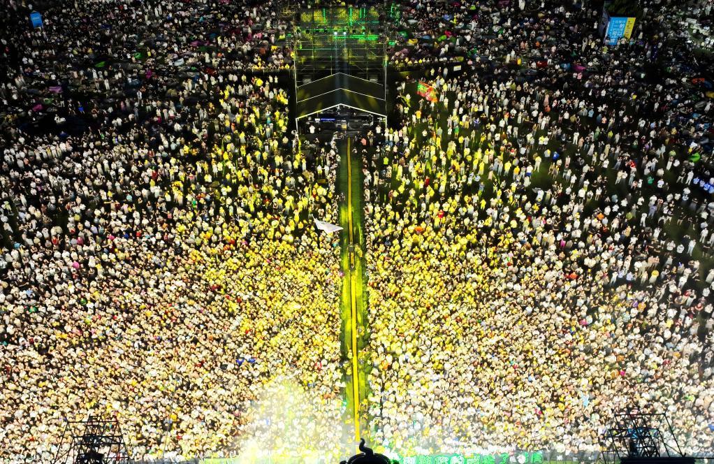 7月19日,在山东省东营市东营文汇河海音乐节,乐迷观看演出(无人机照片)。 新华社发(刘智峰 摄)