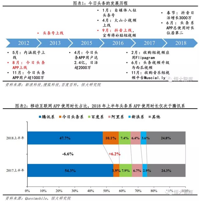 2018年4月,今日头条将整体品牌变更为“字节跳动”,淡化了“今日头条”品牌,这意味着今日头条主营业务由以“资讯分发”为核心转向“资讯分发+短视频”双轮驱动。2012年,张一鸣创建了北京字节跳动科技有限公司,旗下有今日头条APP、内涵段子等多款产品。其中,今日头条APP的知名度最高,而且它的广告收入是公司主要的营收来源,因此“今日头条”成为了公司整体品牌。随着抖音、西瓜视频的崛起,“今日头条”品牌已难以覆盖主营业务,因此公司将整体品牌更名为“字节跳动”。考虑到习惯用法,本报告依然使用“今日头条”来指代北京字节跳动科技有限公司,“今日头条APP”指代今日头条旗下的资讯分发APP。