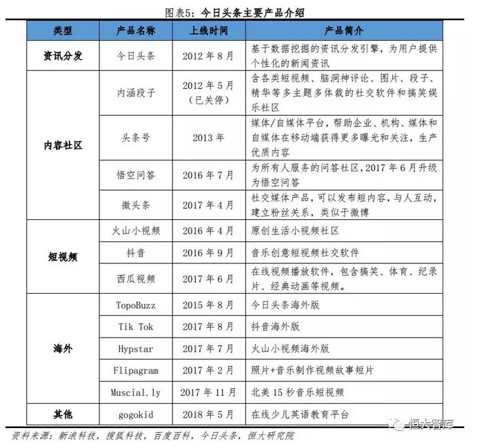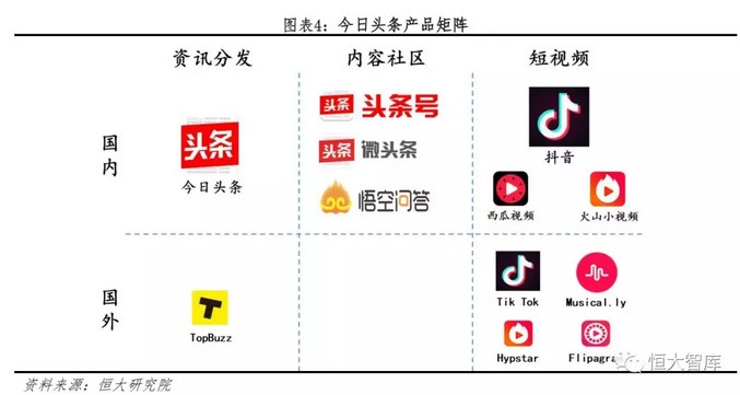 今日头条战略重心的转移推动了产品的多元化,形成了“资讯分发+内容社区+短视频+海外”的核心业务矩阵: