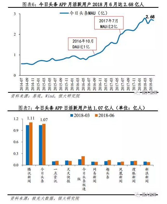 2)兴于短视频:2016年今日头条All in短视频,推出“抖音+火山小视频+西瓜视频”的产品矩阵,通过巨额补贴和营销投入使其在众多短视频应用中脱颖而出,头条系三大短视频APP进入行业TOP4,成功收割短视频流量红利。2018年6月抖音DAU过亿,成功登顶短视频DAU榜单。