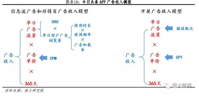 信息流广告收入模型:DAU×单日用户广告浏览量×CPM×365。极光大数据显示,2018年6月今日头条APP的DAU为1.07亿。笔者测算部分数据:(1)使用时通常每4-5分钟会下拉刷新一次信息流。(2)每次刷新会出现0-2条广告,假设广告加载率取1篇。今日头条官方数据显示,今日头条APP单日用户使用时长为74分钟,因此单日用户广告浏览数为12-18篇。CPM刊例价为180元/千次,根据投放金额不同,折扣率为0.18-0.21,因此实际CPM为32-38元/千次。基于上述数据,2018年今日头条APP信息流广告收入为149.97-267.14亿元,中值约205亿元。