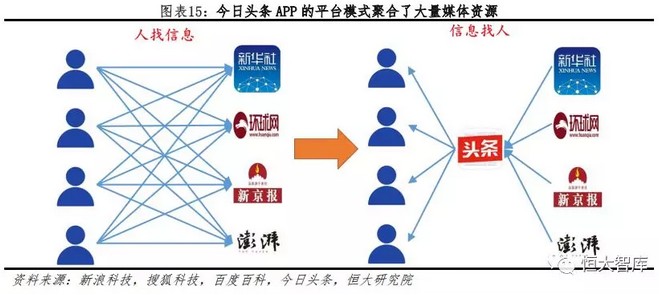 1)始于资讯:今日头条以资讯分发起家,2012年推出今日头条APP,依托“算法编辑+智能分发”,实现“信息”找“人”,迎合移动互联网时代碎片化、多场景的阅读需求,在移动新闻资讯领域直面腾讯、网易竞争,从混战中脱颖而出。