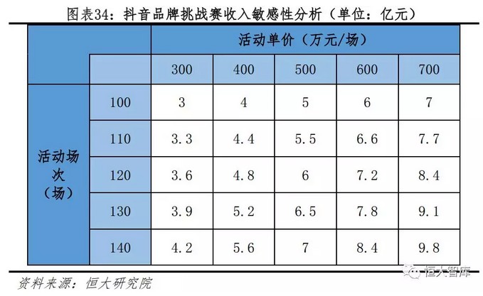 品牌挑战赛收入模型:活动场次×活动单价。抖音在2018年度营销峰会上透露,在半年时间里约有48个品牌发起了61场挑战赛,预计全年场次为100-140场。根据抖音销售提供的数据,品牌挑战赛最早价格为240万元/场,后来涨至400万元/场,资源包价格最高可达1000万元/场,品牌挑战赛单价均值预计为300-700万元/场。基于上述数据,我们推算品牌挑战赛收入为3-9.8亿元,中间值约6亿元。