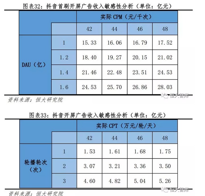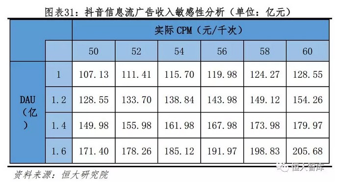 信息流广告收入模型:DAU×单日用户广告浏览量×CPM×365。2018年6月抖音官方公布的DAU为1.5亿,预计2018年全年DAU均值在1-1.6亿区间内。易观数据显示,抖音单日人均启动次数为5.87次。信息流广告在打开APP的第4个视频流出现,且每次打开仅出现1次,广告加载率为1条。因此,单日用户广告浏览数为5.87篇。抖音信息流广告CPM刊例价为240元/千次,折扣率为0.21-0.25,实际CPM为50-60元/千次。基于上述数据,我们推算抖音信息流广告收入为107.13-205.68亿元,中间值约150亿元。