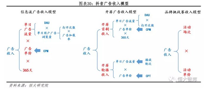 电商链接在2018年5月上线,目前仍然未大规模铺开,而不少KOL营销广告由网红直接承接,抖音平台并未获得收入分成。因此,我们估算了信息流广告、开屏广告和品牌挑战赛三种形式广告的收入。