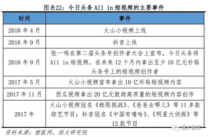 2016年,今日头条将战略重心从资讯分发转向短视频,不仅推出了“抖音+火山小视频+西瓜视频”产品矩阵,而且拿出了巨额补贴。2016年9月,今日头条上线了抖音,并且宣布将All in短视频,拿出10亿补贴头条号上的短视频创作者。2017年5月,今日头条旗下的火山小视频宣布将拿出10亿补贴短视频内容,并且对内容达人推出养成计划,进行长期流量扶持。此外,火山小视频、抖音在2017年分别冠名了10多款综艺节目,包括头部综艺《极限挑战》和《中国有嘻哈》。