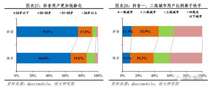 凭借“音乐+短视频”带来的炫酷时尚元素和画面冲击感,抖音成功切入一、二线城市年轻群体的市场空白。追求平等使得快手有趣且接地气,广场舞大妈和工地生活让快手打开了草根市场,却也带上了“低档次”的标签,快手很难满足都市白领丽人的短视频消费需求。抖音定位于“音乐+短视频”,全面屏的展示、代入感的音乐、俊男靓女的KOL、极富视觉冲击效果的视频以及富有创意的内容,炫酷、时尚、个性化的短视频让抖音迅速填补了一、二线城市年轻群体的市场空白。2018年1月抖音用户画像显示,与快手相比,抖音用户更加低龄化,且一、二线%。凭借差异化的目标群体和产品定位,抖音打开了细分市场,突破了快手等短视频头部企业的围剿。
