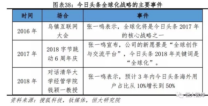 随着国内流量见顶,进军海外市场挖掘新用户成为了中国互联网企业的必然选择。2016年末,今日头条开始将“全球化”作为公司的核心战略之一,并且在2018年将公司愿景从“将信息与人进行连接,做一个懂用户的平台,从而促进创作与交流”升级为“全球创作与交流平台”,明确提出要在未来三年将海外用户比例提升至50%。