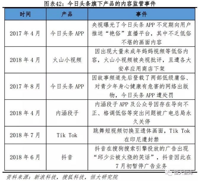 频频出现的不良内容使今日头条旗下产品面临监管风险,今日头条APP和抖音已多次遭约谈整改,内涵段子被永久关闭,抖音一度因“侮辱英烈”事件下线广告。尽管标榜“技术中立”、“算法没有价值观”,但是今日头条APP和以抖音为首的短视频依然是信息传播的媒介,传播正面、有价值、有营养的信息是义务也是责任。头条系产品已频频因为低俗、色情、负面价值观等原因遭遇相关部门的约谈、处罚和整改,仅2017年一年其就遭到国家网信办的4次约谈,旗下的内涵段子在2018年4月直接被国家广电总局永久关闭。