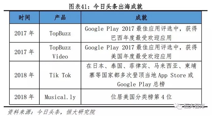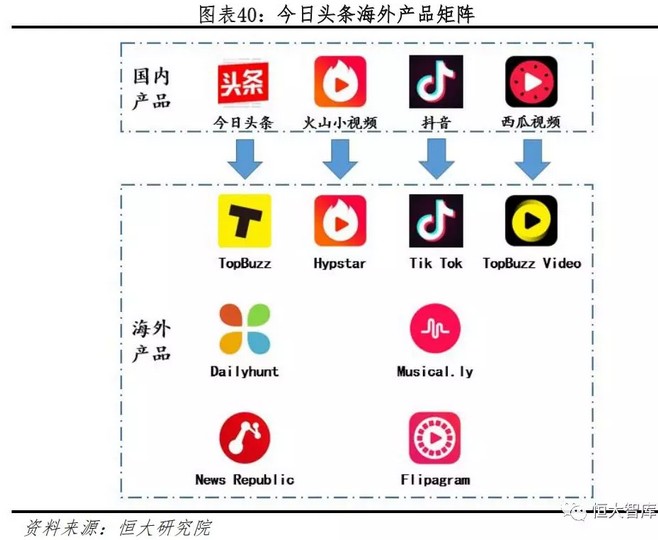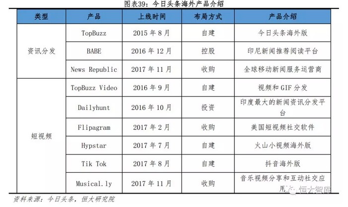 “复制”国内的产品线,减少出海的不确定性。TopBuzz、Hypstar、Tik Tok和TopBuzz Viedo直接对应了今日头条APP、火山小视频和抖音,将成熟的运营经营、技术能力带入了海外市场。Musical.ly、News Republic和Flipagram等大手笔的海外并购同样以资讯分发和短视频作为主线。