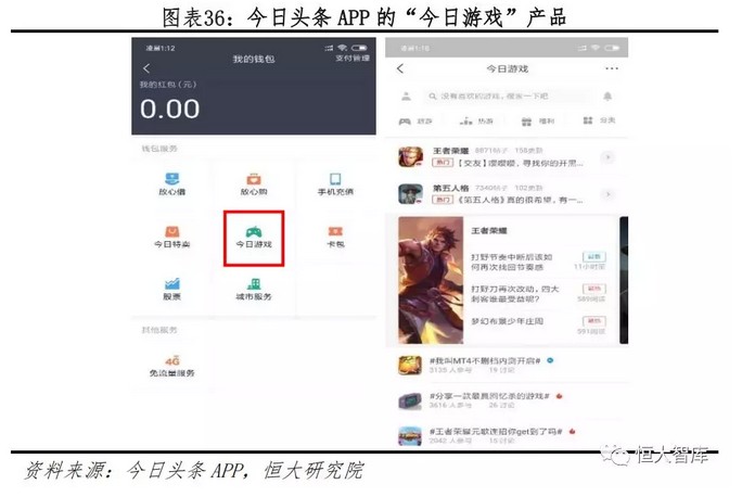 2018年6月14日,今日头条的安卓APP上线了“今日游戏”模块,其入口设置在“我的-我的钱包-今日游戏”里。该模块不仅包括各种手机游戏的下载链接和自媒体的游戏稿件,而且为游戏研发商的活动推广和宣传提供广告位,涉足游戏分发运营。