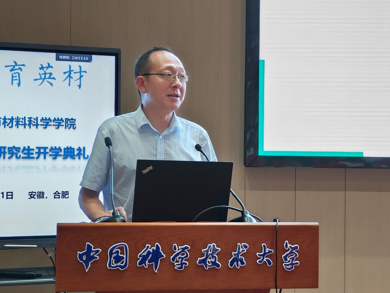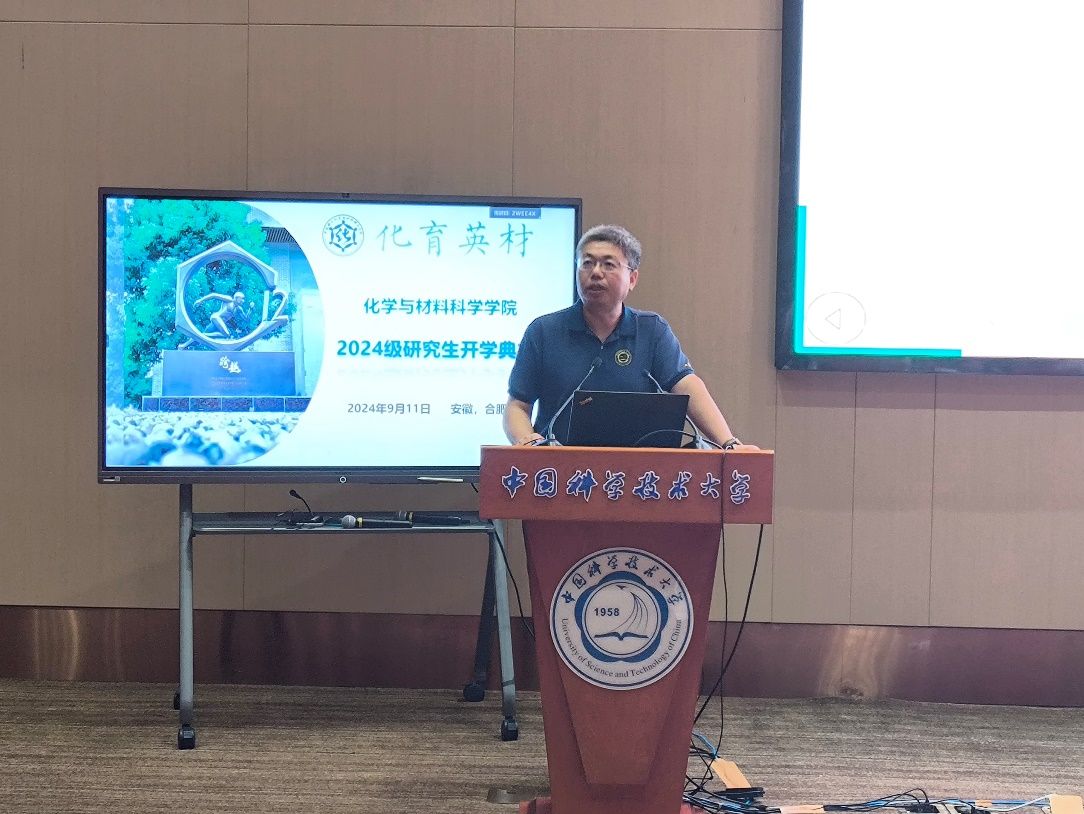 刘世勇首先为开学仪式致辞。刘世勇代表学校研究生院热烈欢迎新同学的加入,并简要介绍了化学与材料学科的发展前景。他勉励在座的研究生不要简单地把满足毕业要求作为读研的目标,希望同学们秉承科大校训,以创造新的知识为己任,推动化学与材料学科的发展。