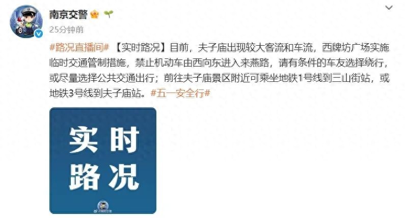 实施临时交通管制措施,禁止机动车由西向东进入来燕路,请有条件的车友选择绕行,或尽量选择公共交通出行;前往夫子庙景区附近可乘坐地铁1号线号线到夫子庙站。
