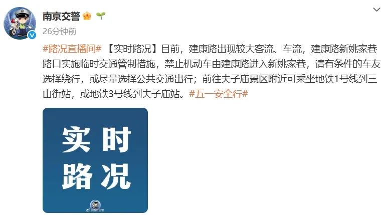 目前,建康路出现较大客流、车流,建康路新姚家巷路口实施临时交通管制措施,禁止机动车由建康路进入新姚家巷,请有条件的车友选择绕行,或尽量选择公共交通出行;前往夫子庙景区附近可乘坐地铁1号线号线到夫子庙站。