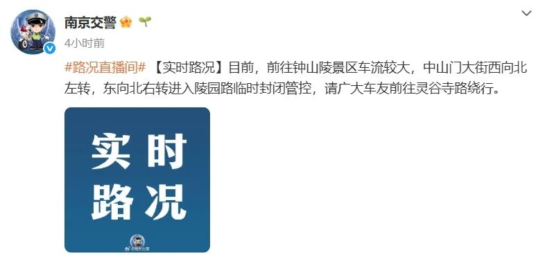 目前,前往中山陵景区车流较大,中山门大街西向北左转,东向北右转进入陵园路临时封闭管控,请广大车友前往灵谷寺路绕行。