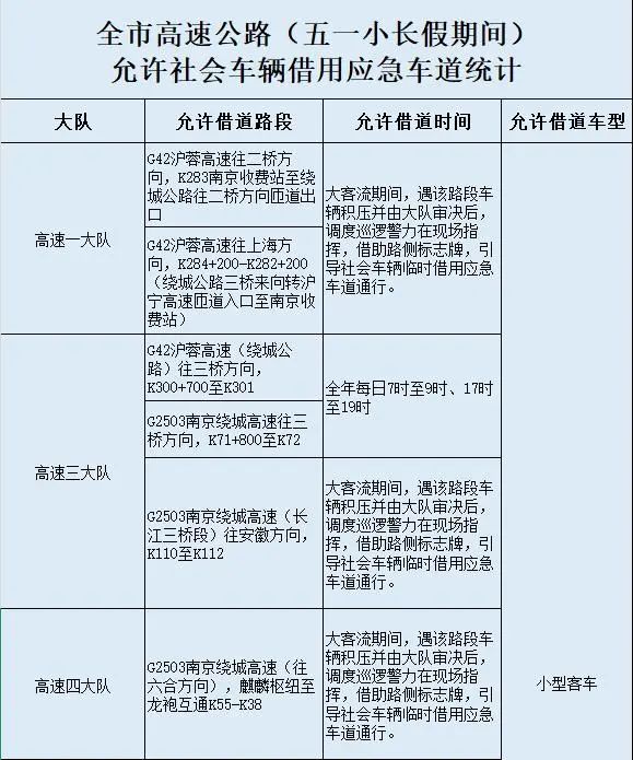 南京交警将采取间断开放应急车道管控措施,具体为:沪蓉高速南京收费站至绕城公路往二桥方向匝道出口,绕越高速麒麟枢纽至龙袍互通,绕城高速大胜关长江大桥往安徽方向,绕城高速往六合方向,宁宣高速往高淳方向等11个点段,允许小型客车临时借用应急车道通行,请过往车辆注意观察路面标志标线,在交通标志引导下,临时借用应急车道通行。