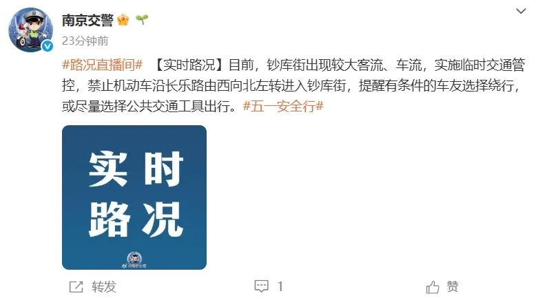 目前,钞库街出现较大客流、车流,实施临时交通管控,禁止机动车沿长乐路由西向北左转进入钞库街,提醒有条件的车友选择绕行,或尽量选择公共交通工具出行。