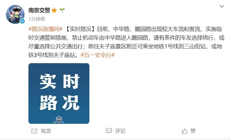 目前,中华路、瞻园路出现较大车流和客流,实施临时交通管制措施,禁止机动车由中华路进入瞻园路,请有条件的车友选择绕行,或尽量选择公共交通出行;前往夫子庙景区附近可乘坐地铁1号线号线到夫子庙站。