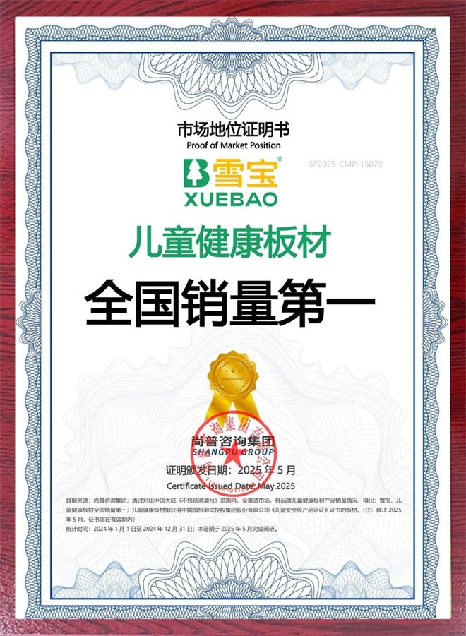 2025年5月,中国板材行业迎来里程碑事件——雪宝板材凭借其在儿童健康板材领域的卓越表现,荣获尚普咨询集团颁发的“儿童健康板材全国销量第一”权威认证。这一殊荣不仅印证了市场对雪宝板材的高度认可,更标志着中国家庭在儿童居住环境健康领域迈出了关键一步。