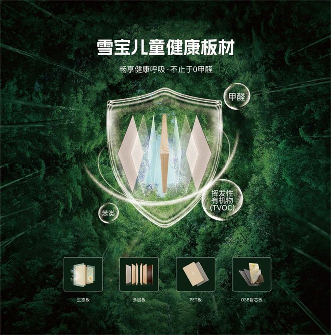 更值得关注的是,雪宝板材产品通过了第三方权威检测,甲醛释放量优于国家ENF级标准5倍,达到国际领先的HENF级(0.005mg/m³)。这一数据意味着雪宝板材在环保性能上达到了行业顶尖水平,为儿童营造了一个近乎零甲醛的健康居住环境。此外,雪宝板材还成为首个通过“儿童安全级产品认证”的板材品牌,这一认证是对其产品安全性和可靠性的高度肯定。