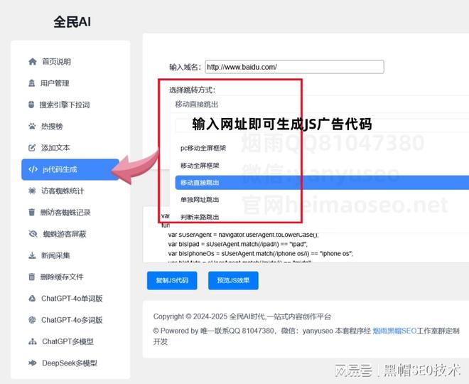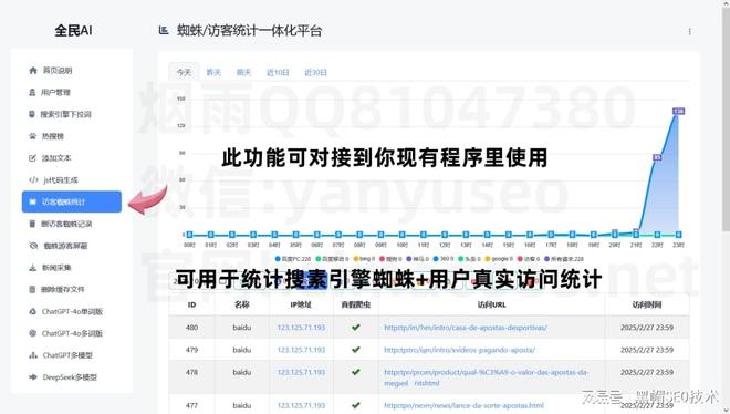 统计与广告功能为了帮助创作者更好地分析访客行为,平台提供访客统计、蜘蛛统计和删除蜘蛛统计功能。此外,用户还可以在线生成JS广告代码,方便在内容中插入广告。结论在全民AI时代,ChatGPT-4多模型和DeepSeek-V3R1多模型为内容创作者提供了强大的工具,帮助他们更高效地生成高质量的内容。无论是对话生成、推理模型,还是搜索引擎支持和新闻采集功能,这些平台都在不断推动内容创作的边界。
