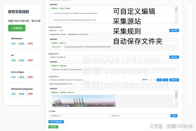 新闻采集与法律合规在内容创作中,新闻采集是一个重要的环节。平台支持自定义编辑采集规则,但用户需遵守相关法律法规,切勿采集未经授权的网站文章,所有后果由使用者自行承担。