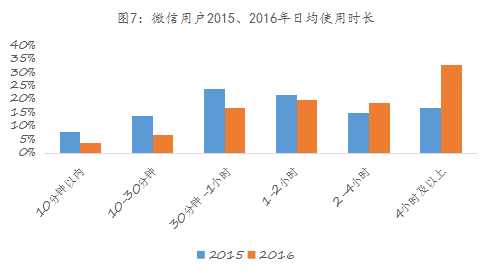 根据中国信息通信研究院调查,2016年微信用户对微信的依赖程度较2015年有所加重,日均使用时长在4小时以上的用户,较2015年增加了一倍。可见,微信的用户黏性在不断上升,重度用户在不断增加。