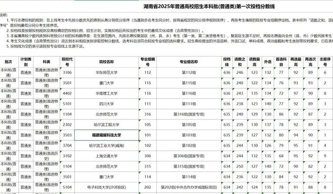 投档线是按照投档规则及高校确定的投档比例、招生计划,实施投档后所投出的考生中的最低文化成绩(含政策性加分)。据湖南省教育考试院公布的2025年本科批第一次投档分数线信息,物理类投档线分,武汉大学第107组680分排在第二位,北京大学医学部第101组679分排第三位。而福耀科技大学第101组投档线组、厦门大学第115组、华南理工大学第116组、四川大学第111组。