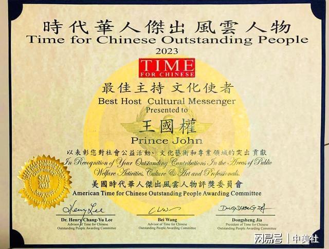 8月31日,在纽约曼哈顿时代广场,王国权被美国时代华人杰出风云人物评奖委员会破例提名,授予“最佳主持人及文化使者”荣誉称号。颁奖证书由美国六任总统顾问王碚先生及华人神探李昌钰先生亲笔签名,评审委员会包括美国酒店大王林建中、杰出华人靳羽西等重量级人物。委员会主席贾东升高度评价王国权在纽约各界活动中的出色表现,称其为主持界的翘楚和文化交流的使者。这一荣誉不仅是对他个人才华的肯定,更是对其推动中美文化互鉴的认可。